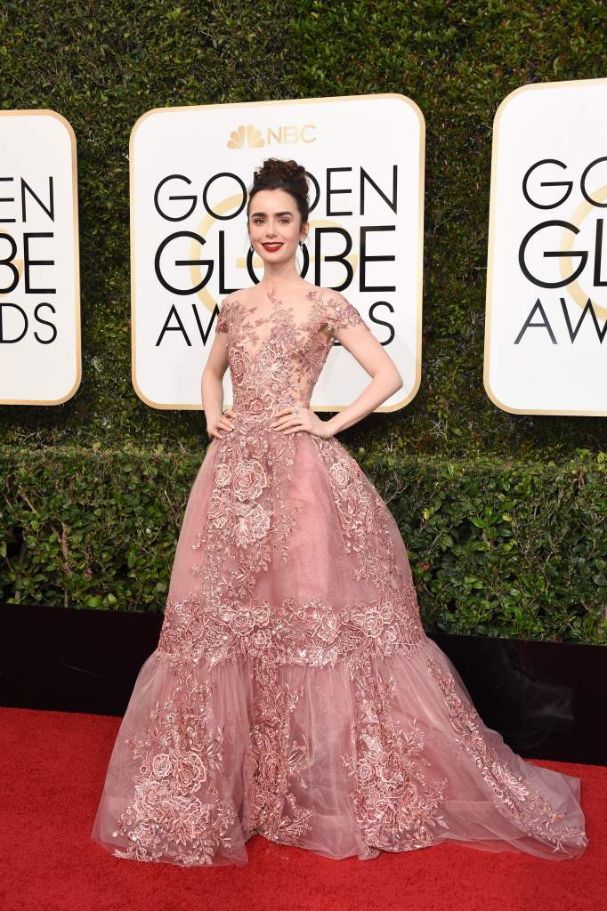 Lily Collins en la alfombra roja de los Globos de Oro 2017. (Getty)