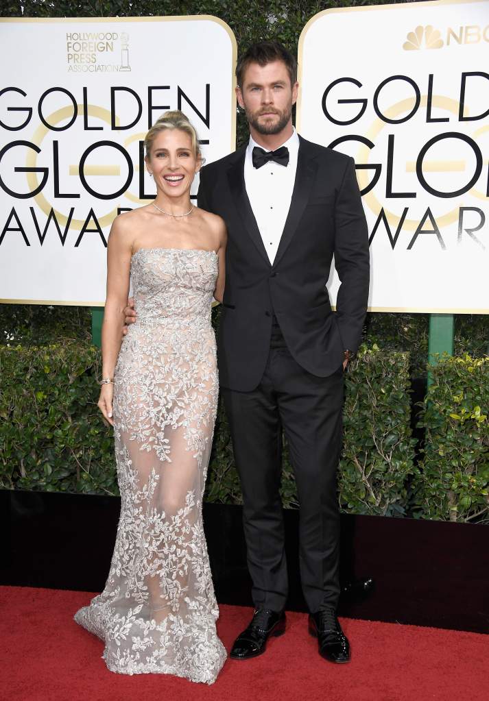 Chris Hemsworth y su esposa Elsa Pataky en la alfombra roja de los Globos de Oro 2017. (Getty)