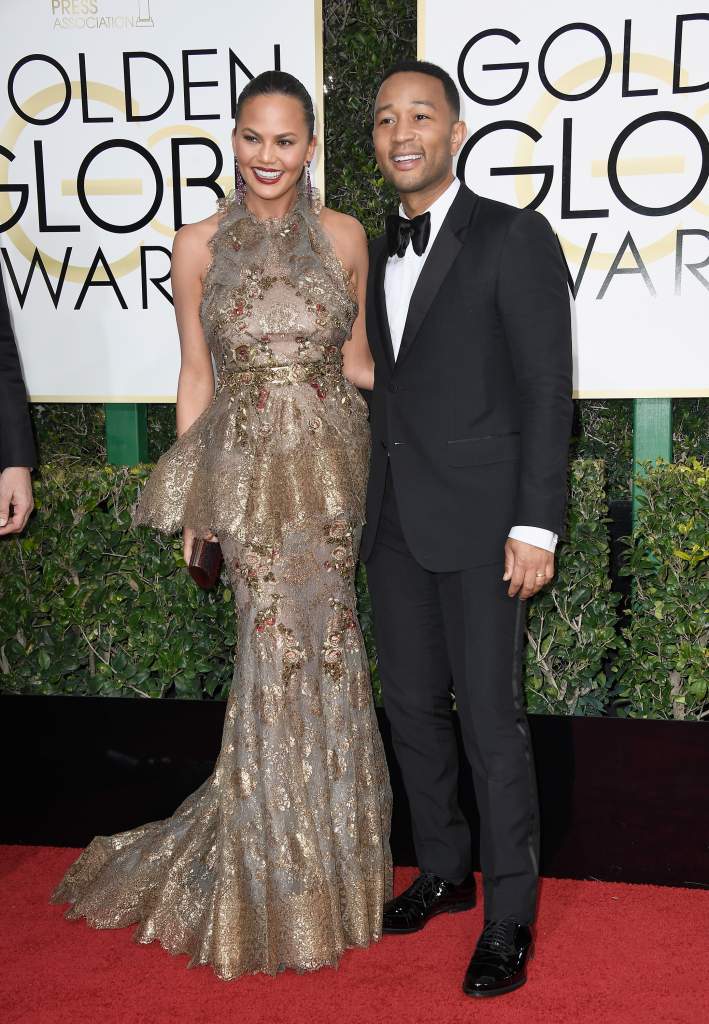 Chrissy Teigen y su esposo John Legend en la alfombra roja de los Globos de Oro 2017. (Getty)