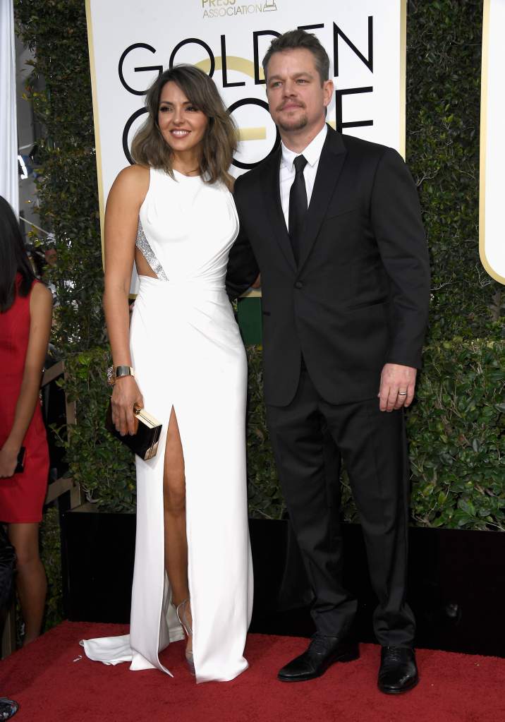 Luciana Barroso y su esposo Matt Damon en la alfombra roja de los Globos de Oro 2017. (Getty)