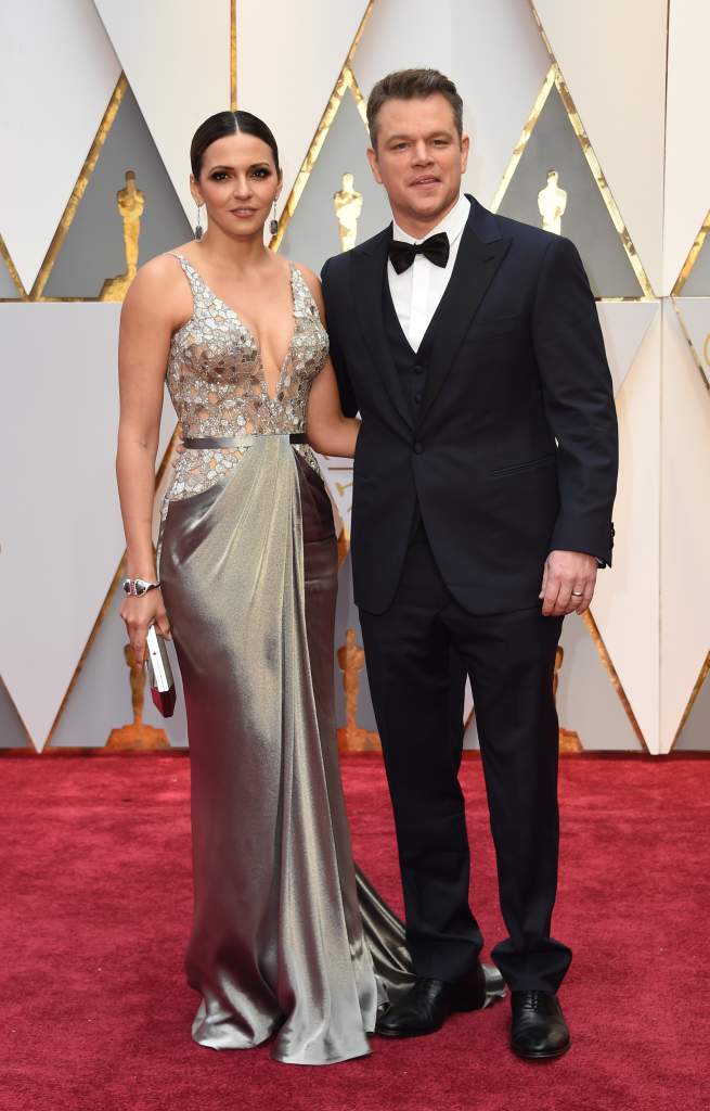 Matt Damon y su esposa Luciana Barroso en la alfombra roja de los Premios Oscar en el Dolby Theater en Hollywood, California. (Getty)