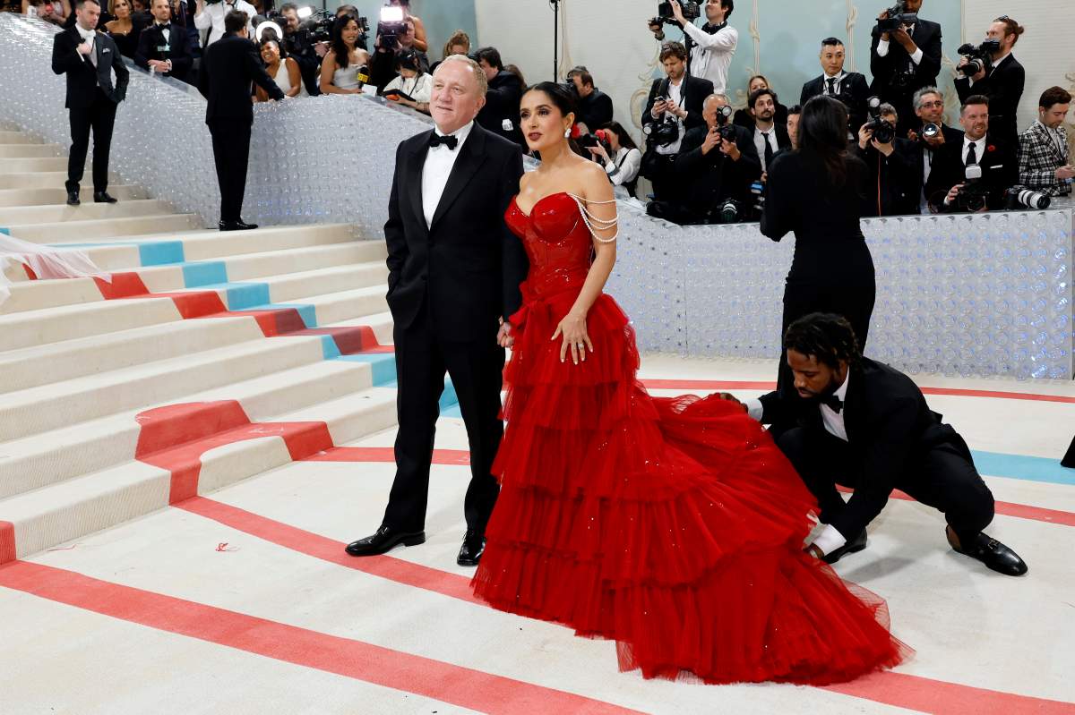 Salma Hayek escogió un sensual ardiente vestido rojo al Met Gala 2023. La actriz de Eternals llegó muy bien acompañada de su esposo Francois-Henri Pinault a la alfombra roja.